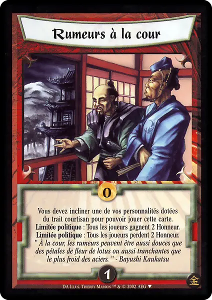 COLLECTORS’ NOTES: There are three versions of this French only promo. This one has art by Thierry Mason and a quote by Bayushi Kaukatsu.