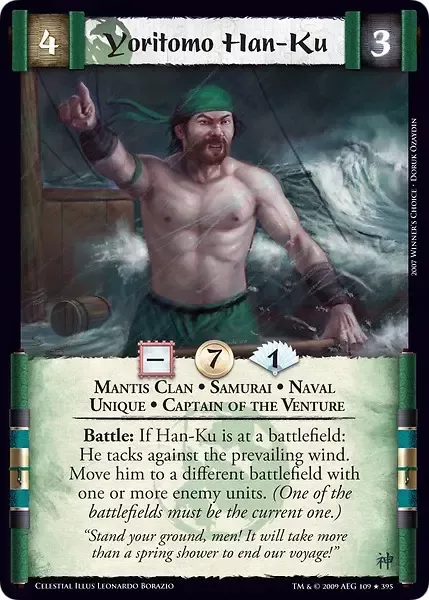 The Destroyer War (Celestial) Battle of Kyuden Tonbo (2010) Before the Dawn (2011) Celestial Draft Pack (2009) Celestial Edition (2009) Celestial Edition 15th (2010) Death at Koten DTP (2009) Empire at War (2010) Forgotten Legacy (2011) Glory of the Empire (2009) Imperial Gift 1 (2008) Imperial Gift 2 (2009) Imperial Gift 3 (2010) Path of the Destroyer (2009) Promos Celestial (2009-2010) Promos Celestial-Emperor (2010-2011) Promos Samurai-Celestial (2009) Second City (2011) The Dead of Winter (2010) The Harbinger (2009) The Plague War (2010) War of Honor (2010)